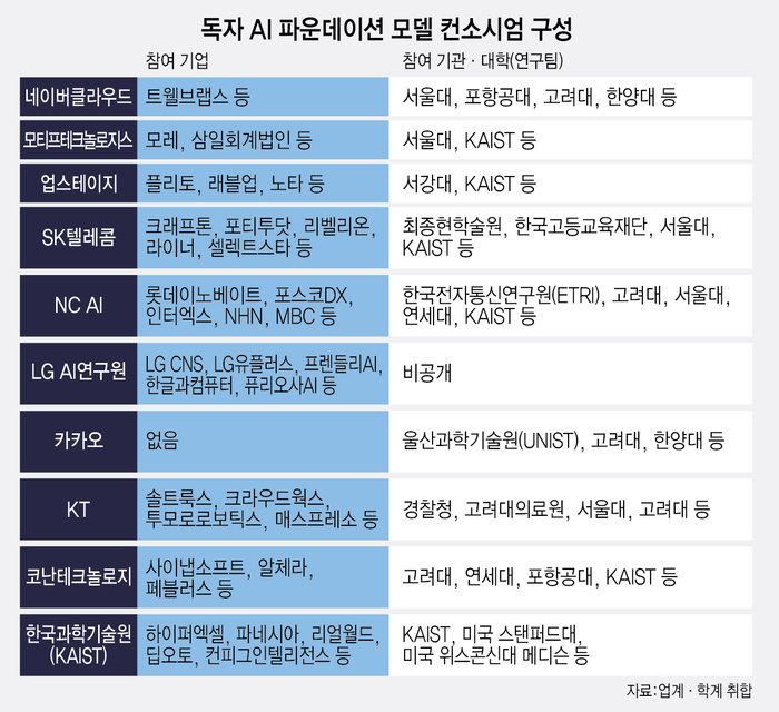 두 번째로, 참여 컨소시엄 및 팀 구성에 대해 알아보겠습니다. 카카오는 해외 모델 파인튜닝 없이 '프롬스크래치' 모델을 강조하며, 울산과학기술원(UNIST), 고려대, 한양대 등 10개 내외 대학팀과 협력하고 있습니다. LG AI연구원은 한컴, 프렌들리AI, 퓨리오사AI, LG CNS, LG유플러스를 포함한 다양한 기업들과 함께 정예팀을 구성하였습니다. KAIST는 해외 석학과 교수 창업기업 등으로 팀을 꾸려, 각기 다른 전문성을 바탕으로 AI 모델 개발에 나섰습니다.